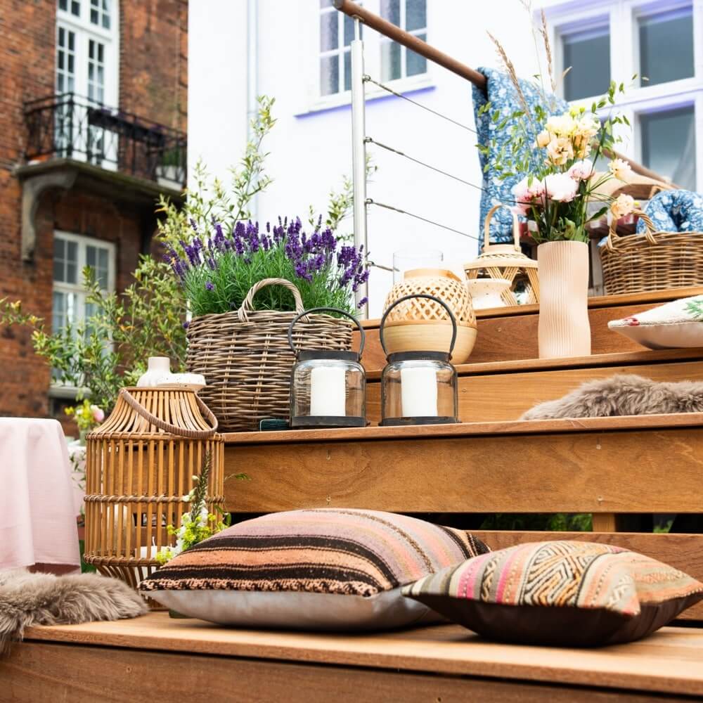 Der er noget særligt at sidde ved café-bordet og nyde duften af sommer, lyden af blade og mærke solens varme mod huden. Og udendørs omgivelserne kan på et ekstra pift af hygge og personlighed med hyggelige kelim pyntepuder.