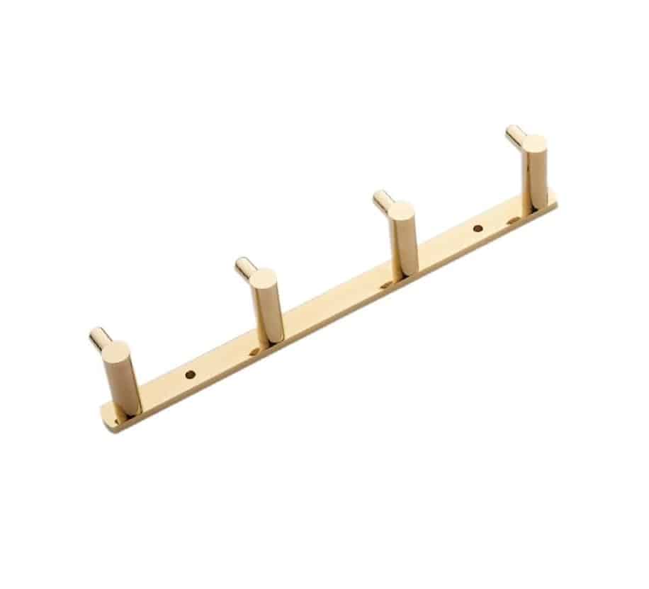 På udkig efter håndklædekroge messing der skaber elegance i bademiljøet? Den 22 cm lange guld messing knage er elegant og tidløs og så passer den perfekt på badeværelset. finehome messing rack har plads til 4 stk. håndklæder, vaskeklude eller viskestykker. Guldkrogene er robuste og så hænger skinnen flot på væggen. De 4 guldkroge hænger med 6,5 cm afstand på messings skinnen. finehome håndklædekroge er fremstillet af kvalitets messing med en flot poleret overflade.