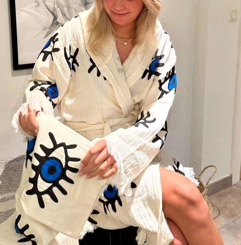 Oplev en kombination af velvære og komfort med denne kimono badekåbe med øjne, lavet med ældgammel anatolsk håndvævningsteknik.