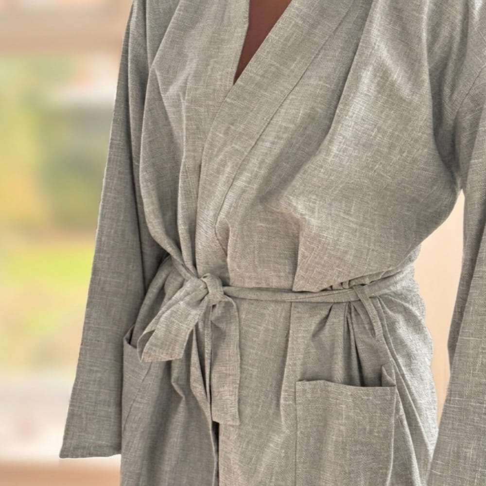 Oplev ægte hverdags luksus med finehome med finehome lysegrå badekåbe i 100% hør. Designet er smukt og stilrent. Unisex-modellen passer til både kvinder og mænd.
