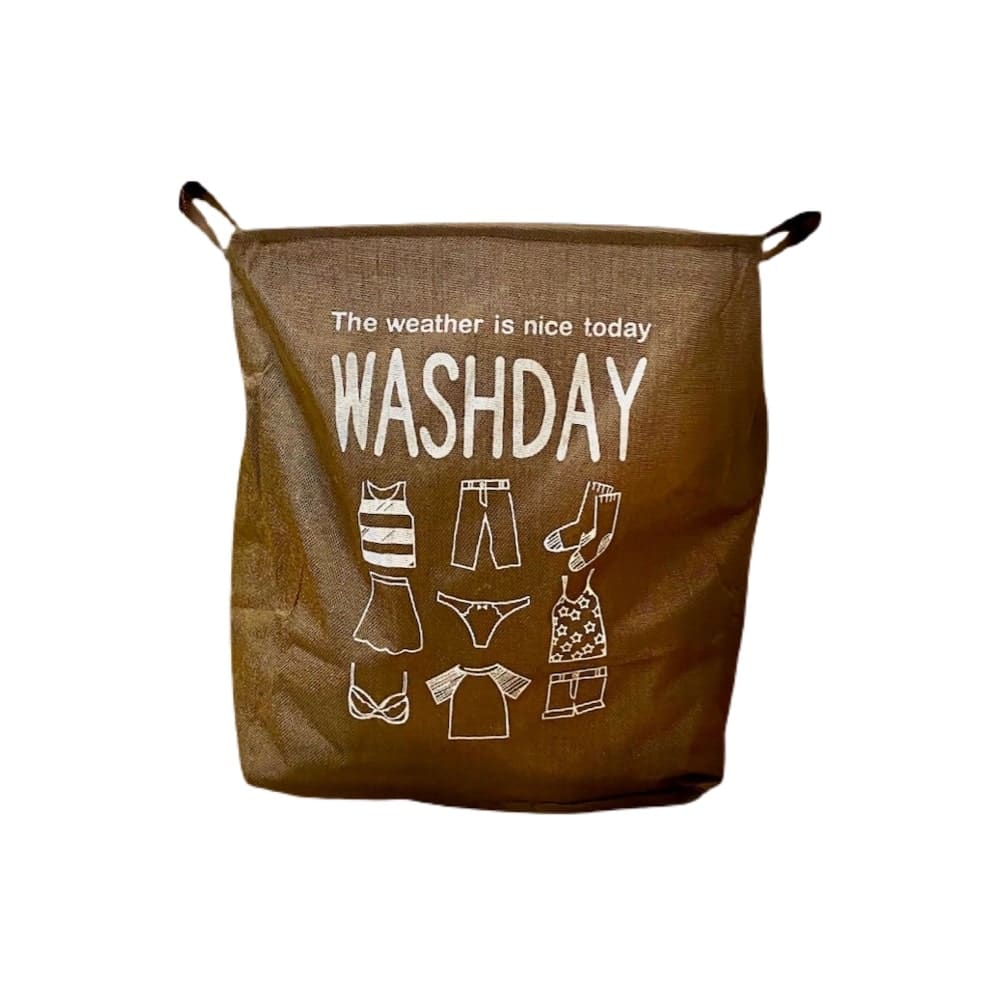 Sammenklappelig brun vasketøjspose med kanvas yderside og plastbelagt inderside. Den rummelige snavsetøjspose med 2 hanke yderst praktisk til opbevaring af snavsetøj. ”The weather is nice today, WASHDAY” er sammen med hvide motiver trykt på den ene side af den praktiske tøjpose. Det er nemt at transportere snavsetøjet fra vaskemaskine til tørresnor med finehome letvægts vasketøjspose. Den tøjpose former sig efter det bløde indhold, men står alligevel stabilt på gulvet.