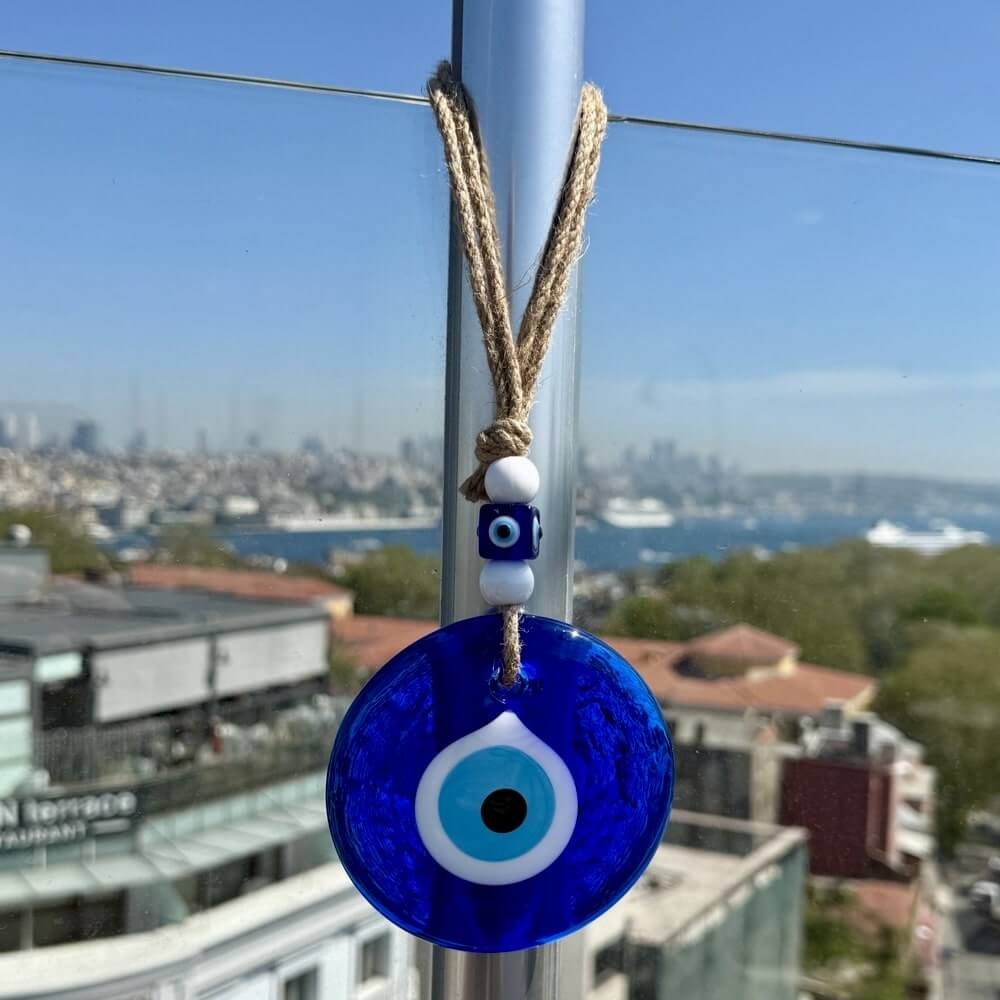 Historien om det blå øje går langt tilbage til antikken. Det er en amulet, der siges at beskytte mod det onde øje. dvs. det er en overtroisk trop på, at misundelse eller beundring kan bringe uheld eller skade. Øjet kaldes også Nazar og bruges blandt andet som udsmykning i sten. Mange familier hænger Nazar stenen over døren eller i vinduerne for at beskytte hjem og familien mod uheld. På grund af sin betydning er øjet blevet en populær souvenir blandt gæster der er på besøg i Tyrkiet. Du kan læse mere om Nazar her.