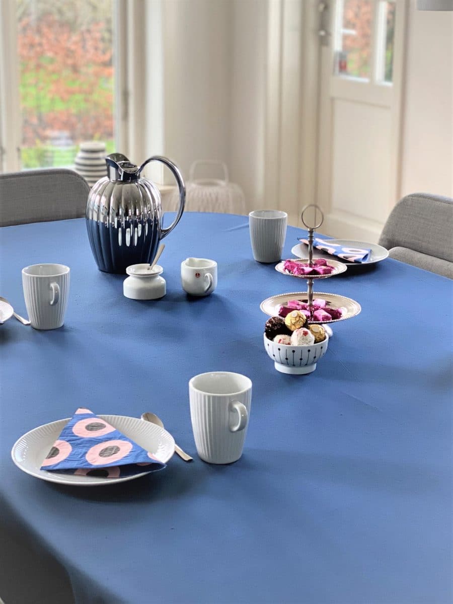 - Den blå borddug kan vaskes i vaskemaskinen ved 40 grader. Den blå dug skal stryges.