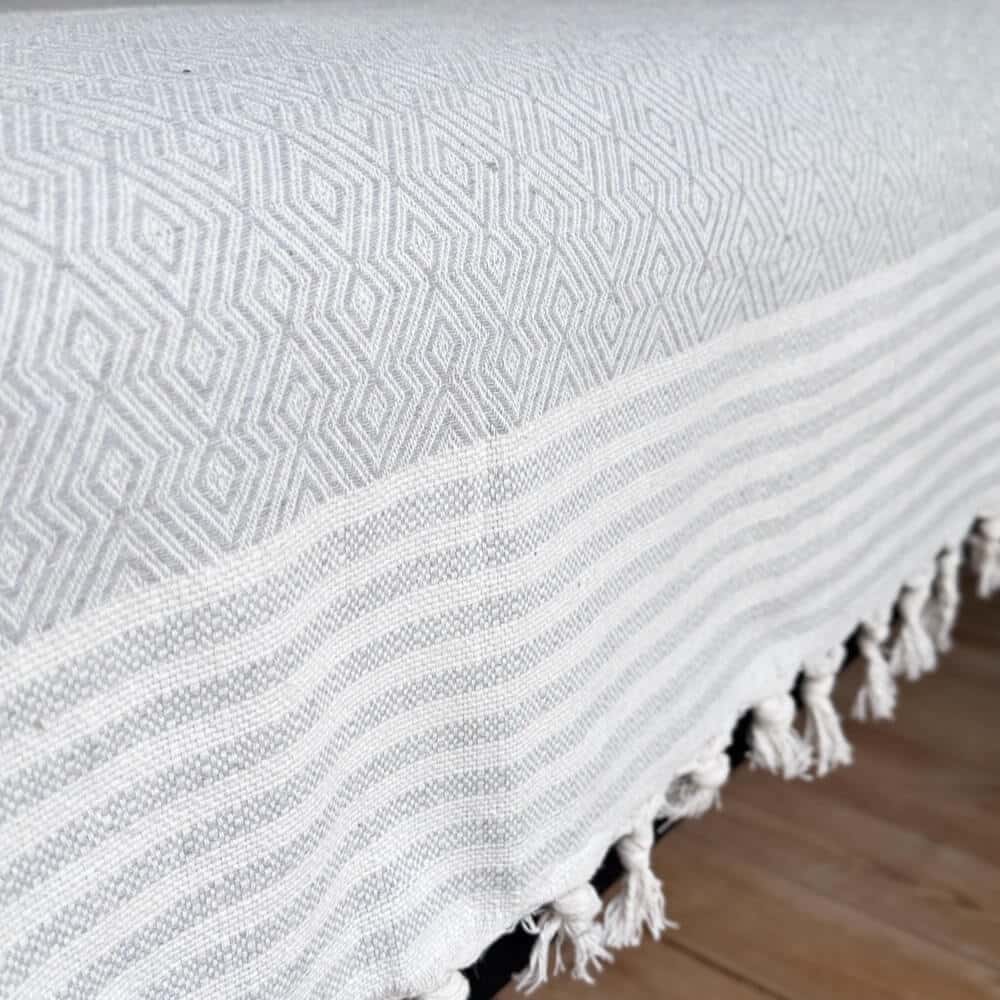 Forny dit soveværelse med et elegant sengetæppe 170×220 cm i lys grå og råhvid med frynser. Med målene 170×220 cm er sengetæppet det ideelle valg til både 120×200 og 140×200 senge. Den smukke farvekombination giver et tidløst og elegant udtryk, der passer til enhver boligindretning. De dekorative frynser tilføjer et strejf af boheme-stil og giver en let og luftig følelse. Komforten i sengetæppet gør det perfekt til at putte sig under på kolde nætter eller som en dekorativ detalje på sengen i løbet af dagen. Det er ikke kun et æstetisk løft, men også en praktisk tilføjelse til dit hjem.
