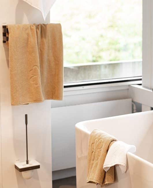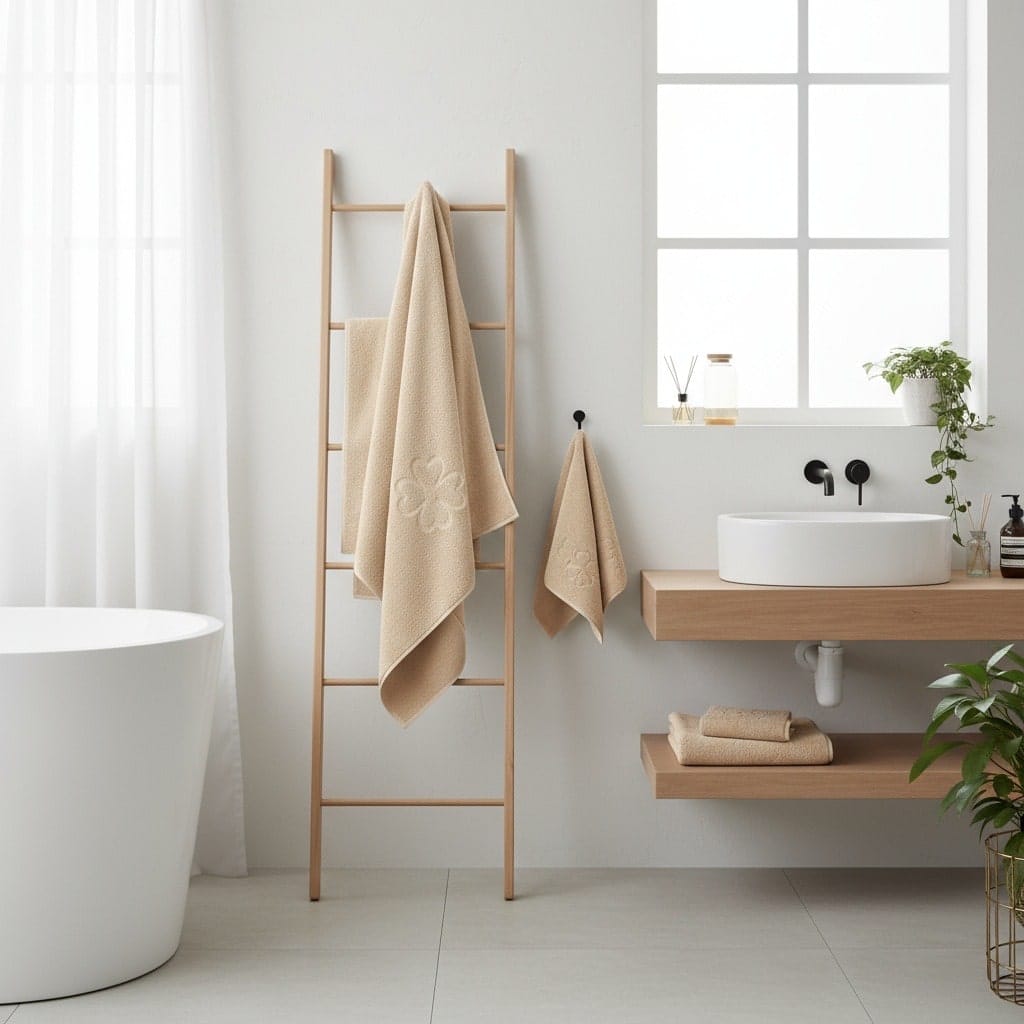 Skab spa-stemning hjemme med sandfarvede økologiske håndklæder i nordisk design.