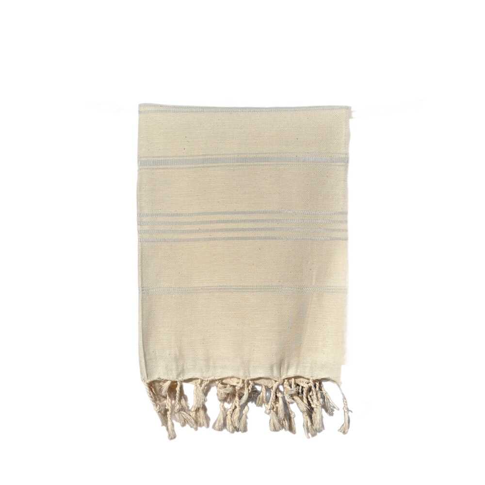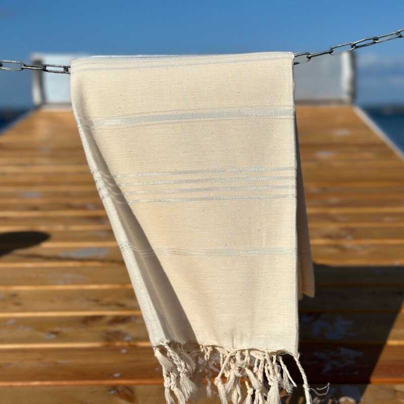 finehome bambus hammam håndklæde er et beige luksus strandhåndklæde i et flot enkelt look med striber i bunden. Looket på hammamhåndklædet er stilrent og fås kun i denne flotte farvekombination. Du kan bruge det store håndklæde på stranden, til yoga og som rejsehåndklæde, Bambus håndklædet vil også kunne pryde ethvert badeværelse på håndklædestangen eller hængende.