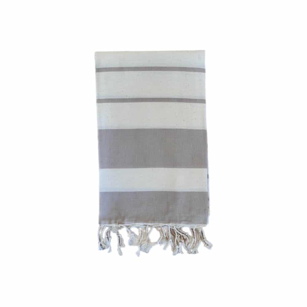 Lækkert og blødt hammam håndklæde i en smuk råhvid/natur og beige stribet design.