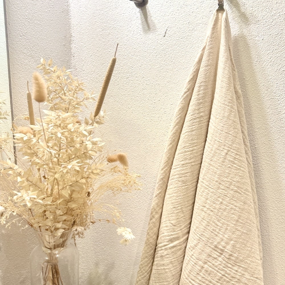 Der findes håndklæder – og så findes der luksus hammam håndklæder. Med sine 95 x 190 cm naturfarvet hammam håndklæde får du luksus fra top til tå – perfekt til et varmt bad og strandturen eller som et let tæppe over skuldrene. Den råhvide naturfarve giver et roligt, rent udtryk, som skaber stemning på badeværelset, i sommerhuset og på rejsen.