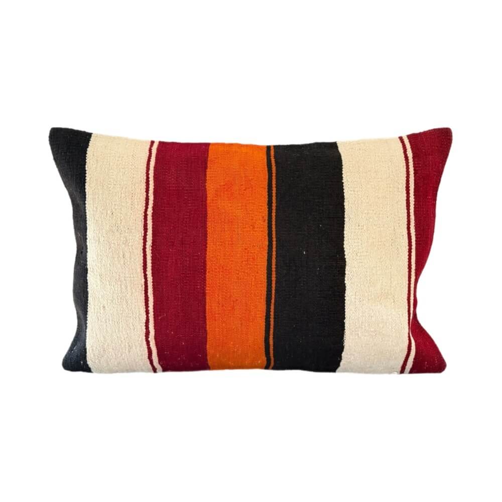 finehome kelim pude Anatolien er lavet af 100 % uld og er håndvævet i Tyrkiet. Den måler 40 x 60 cm og har et smukke multifarvet striber i lyse, røde, orange og mørke farvenuancer. Puden er perfekt til at tilføje et strejf af farve og tekstur til ethvert rum. Den kan bruges som en dekorativ pude på sofaen eller sengen, eller den kan bruges som en praktisk pude til sidde på.