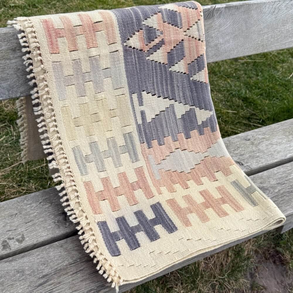 - Kelim er indfarvet med plantefarver og er håndvævet.