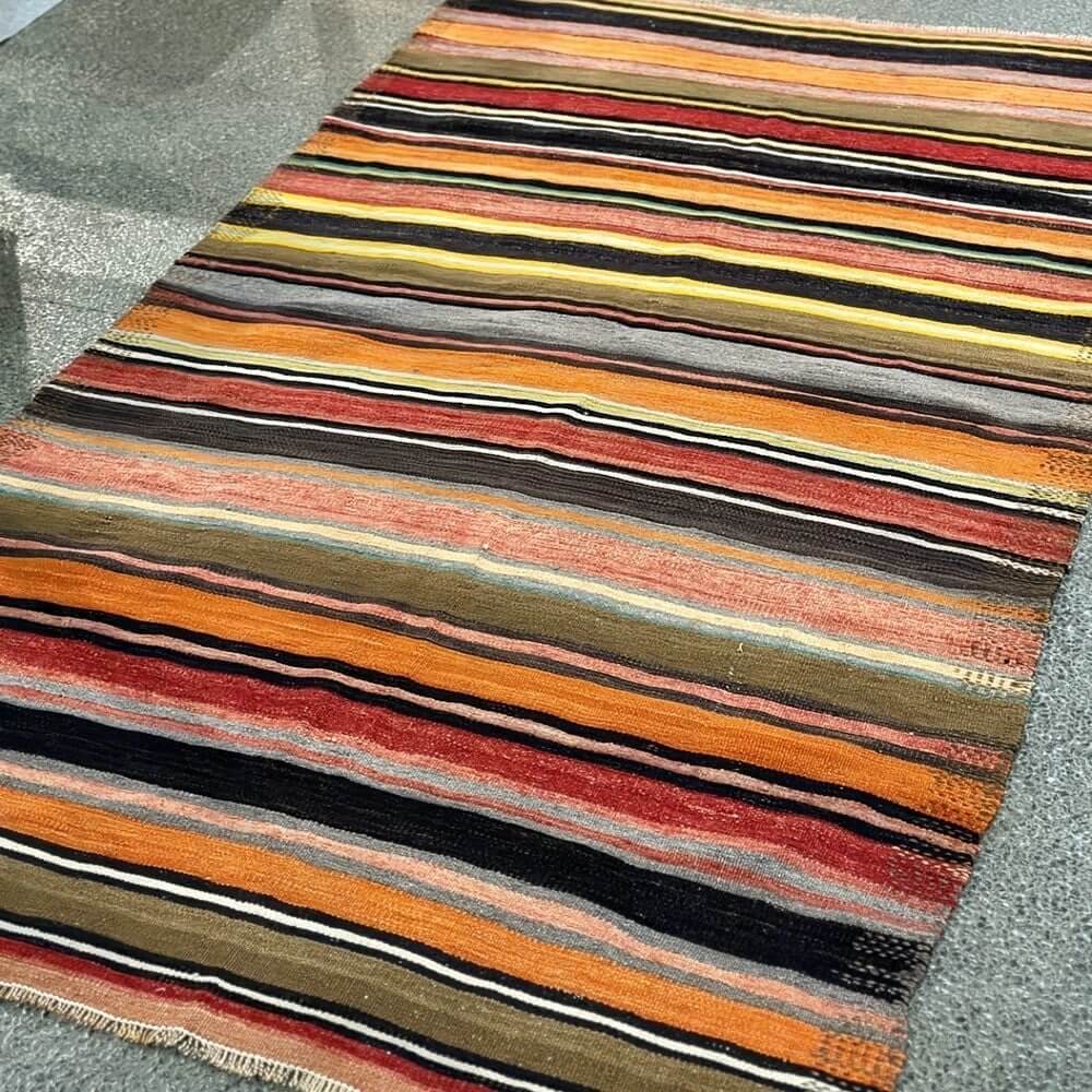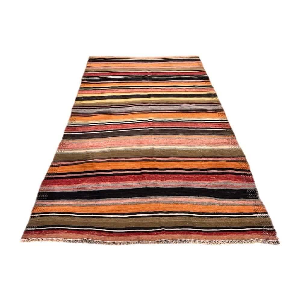 Virkelig smukt vintage anatolsk kelimtæppe og kelimløber. Det ægte orientalske kelim som måler 140×240 cm er vasket og restaureret. Teknikken er håndvævet med unikke striber i meget smukke farver. Vævningen er fin vævetykkelse. Farvenuancerne er i striberne er i . Der findes kun 1 kelimtæppe fra det østlige Tyrkiet med dette mønster. Kelim er i bedste kvalitet.