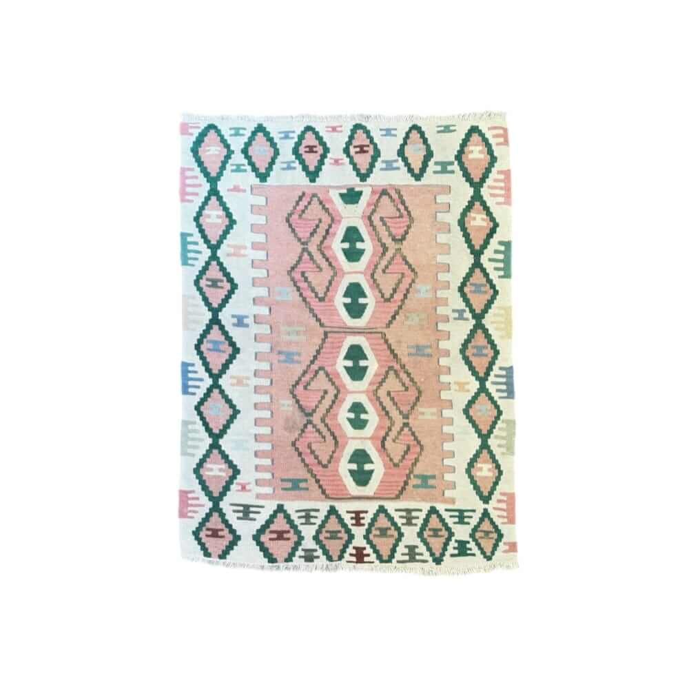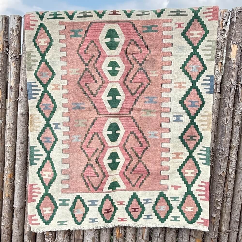 Orientalsk tæppe af ægte håndvævet uld med mange flotte farver – blandt andet lyserød og naturfarve med smukt mønster. Orientalske tæpper er kendt verden over for unikke farver og utrolig flotte mønstre. Brug dit kelimtæppe stue, soveværelse, entré eller de områder, hvor boligen trænger til opfriskning af farver.