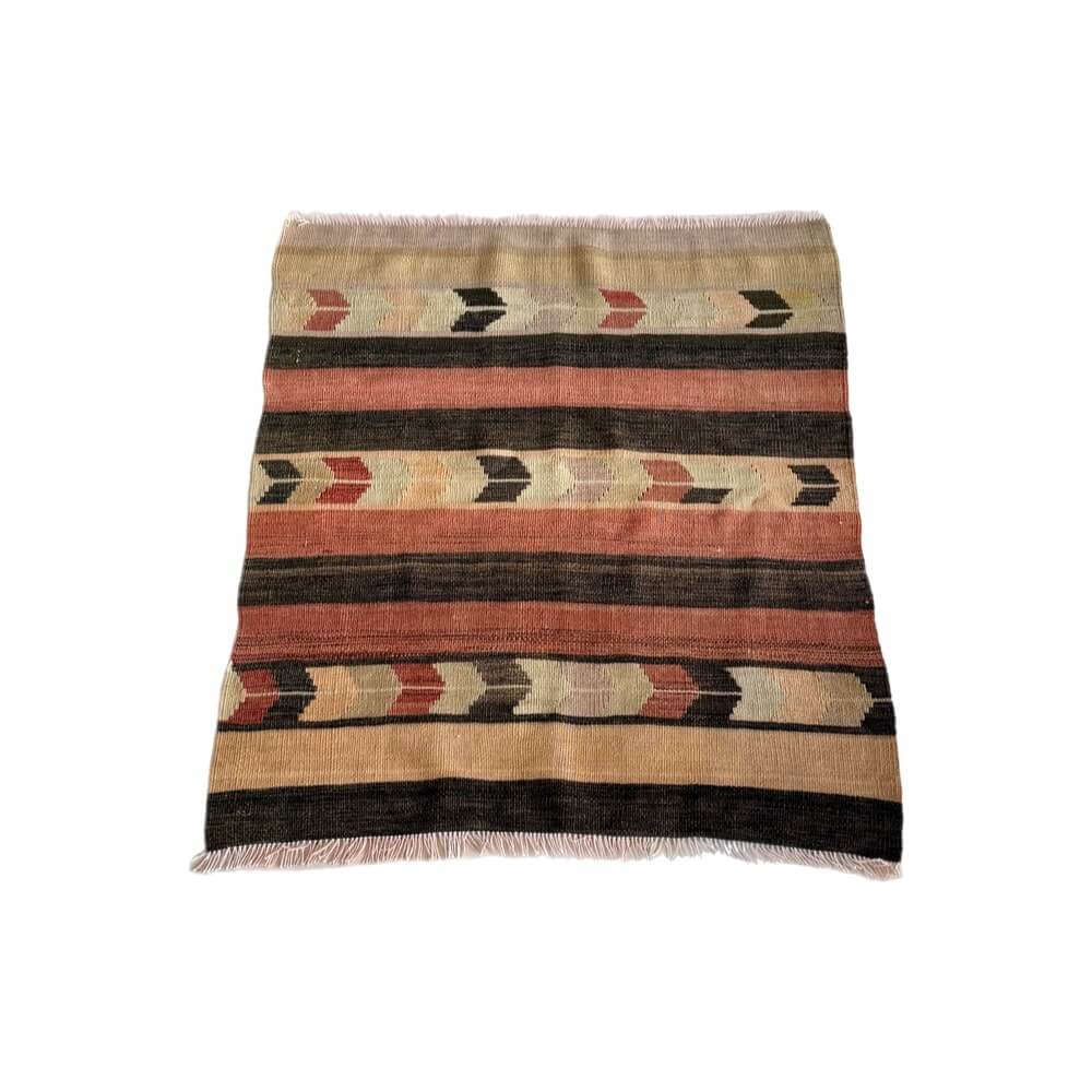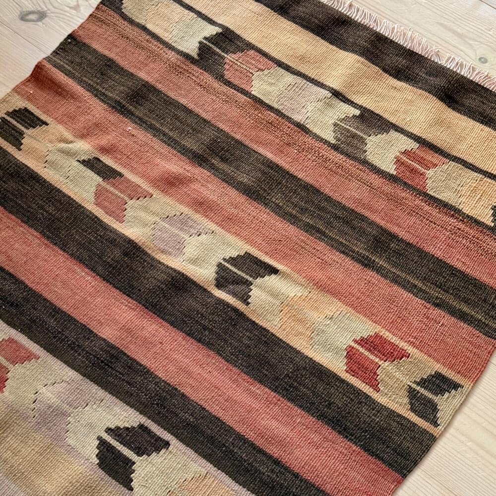 Meget smuk lille kelim løber 85×100 cm fra Anatolien i mørke farver med unikt mønster. Det lille kilim har bruges til hyggelig boligindretning samt til beskyttelse af gulvet på udsatte områder, f.eks. foran terrassedøren, på badeværelset, i den lille entré samt i soveværelset. finehome kelim løber kan sætte prikken over i-et i din boligindretning. Farverne i den lille kilim er fortrinsvis mørke, hvilket gør, at tæppet vil være ideelt foran døren.
