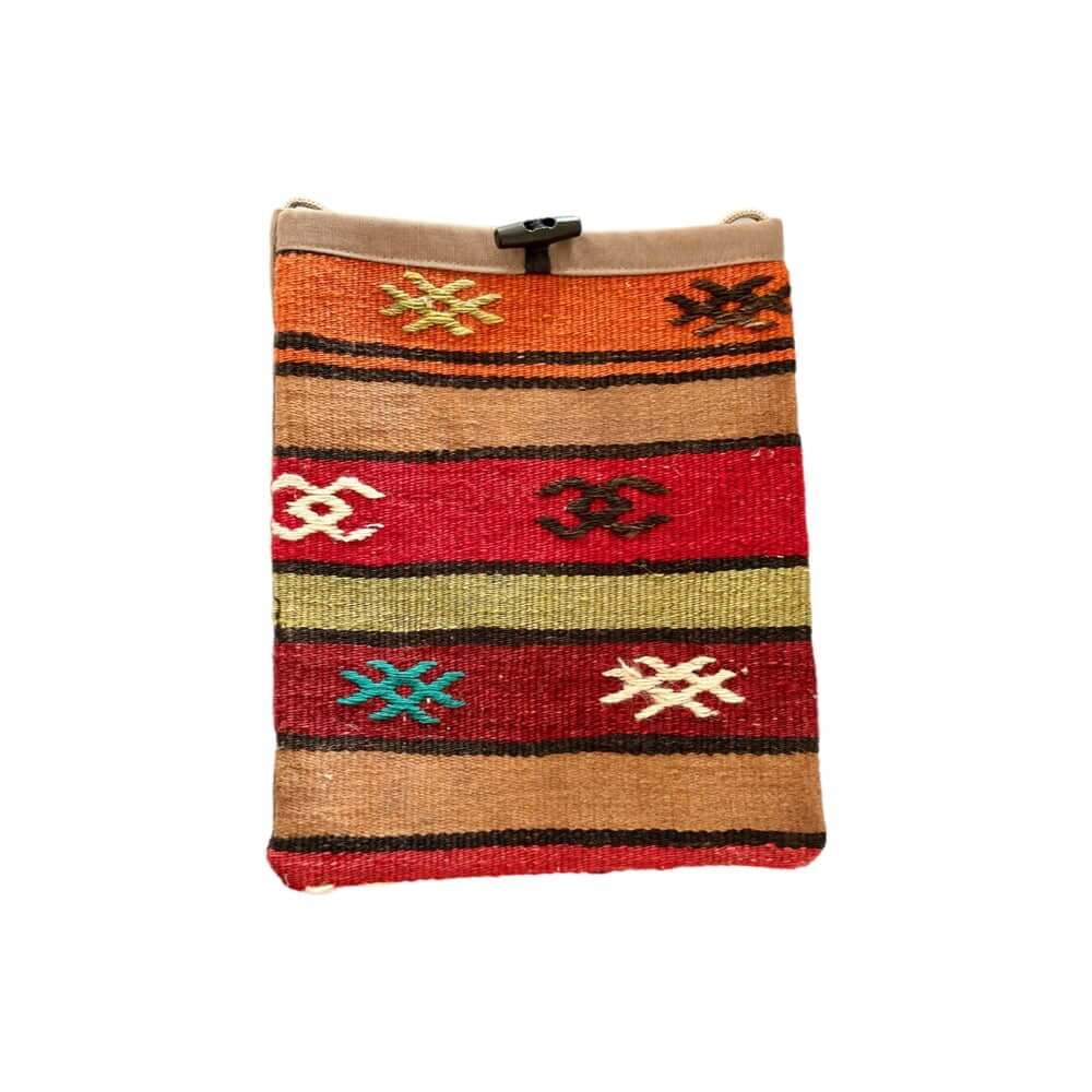 Skal du i byen og kun have få ejendele med som nøgler og pung kan du benytte denne lille ægte farvestrålende kelim taske med mønster. Den lille taske er 25×30 cm har en fin lukning i toppen af tasken med en sort lukke knap. Skuldertasken har desuden en fin rem så du kan bære tasken på skulderen.