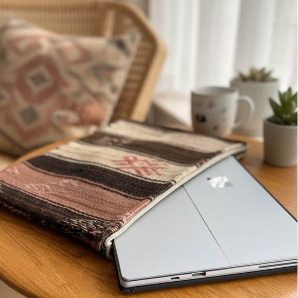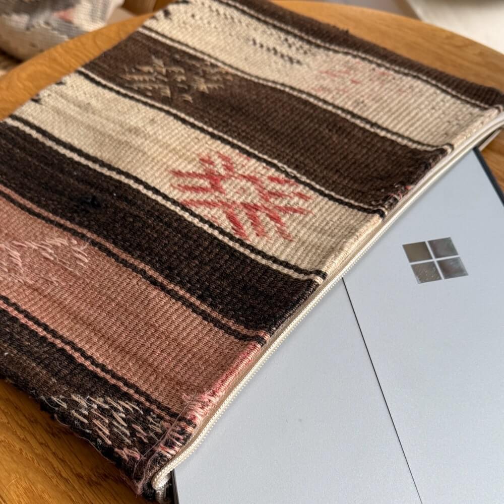 Stilfuld Kelim etui til laptop i vintage kilim – håndlavet og unikt. Dette etui fra danske finehome er et fantastisk valg for at beskytte din iPad og lap top sleeve med stil og sjæl. Finehome håndsyede sleevet er håndlavet af autentisk vintage kelim. Du får et etui som er helt unikt og hver eneste stribe og mønster fortæller sin egen historie. At eje dette smukke kelim etui til din laptop er virkelig noget særligt. Med et eksklusivt kelimtaske til laptop kan man give sin enhed ekstra beskyttelse og stil.