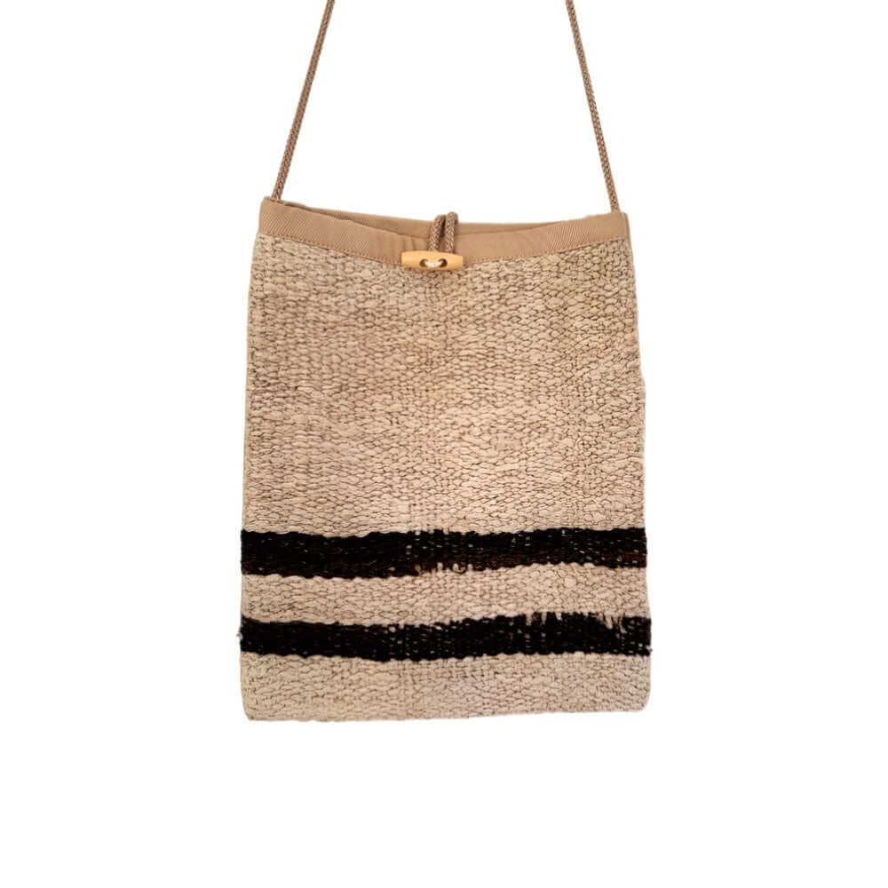 Ægte håndvævet kelim skulder vintage taske i naturfarve med 2 brune striber.